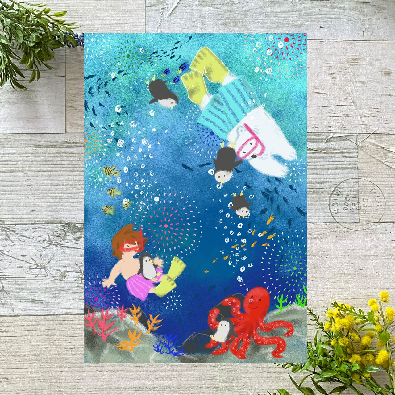しろくま シロクマ 白くま 花火 海 ダイビング 夏 ポストカード メッセージカード 夏休み
